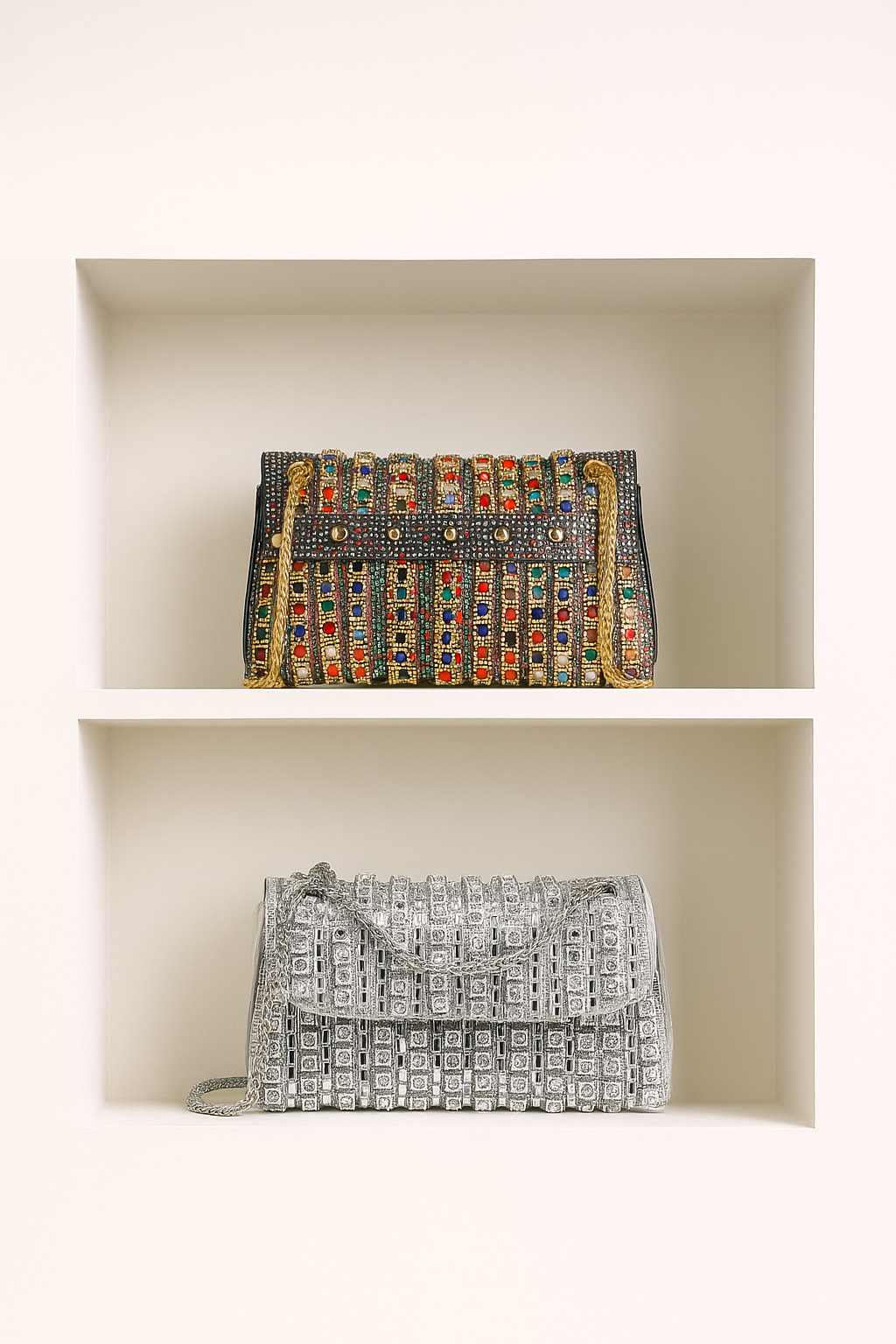 Make a bold statement with this luxury multicolor crystal handbag, a true masterpiece of elegance and craftsmanship. Designed for the modern woman who loves to stand out, this handbag is covered in vibrant gemstones in red, green, blue, and gold hues, creating a dazzling effect that catches the light from every angle.